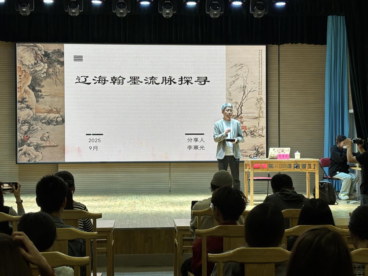 2025年9月19日,鞍山师范学院“博雅论坛”系列学术讲座——《辽海翰墨流脉探寻》于兰芳书场如期举办。本次讲座特邀我校国学中心研究员李熹光主讲,围绕辽海地区书画艺术的历史脉络与文化特质深入剖析并展开交流。国学中心主任金宝、美术学院院长马斌出席了本次讲座。美术学院副院长宋斌主持本次活动,书法学专业师生110余人共同参与。